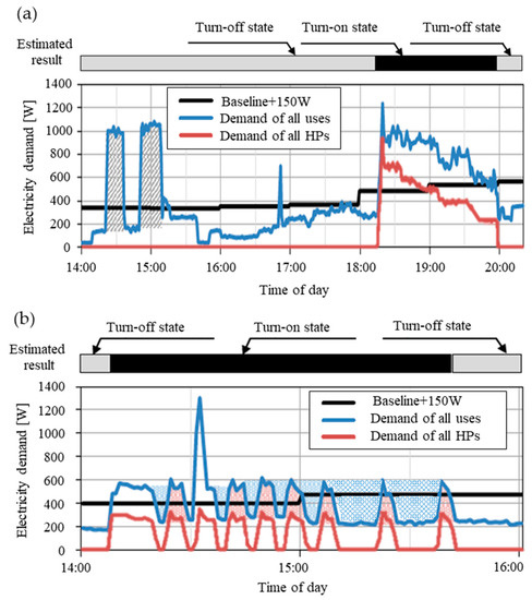 In Figure 12a, the total household demand of all uses recorded approximately 1000 W twice between 14:20 h and 15:20 h for 15 to 20 min. The proposed model accurately identified these events as sequential operation appliances other than HPs; thus, the estimated HP state was turned off. Conversely, the time when the total household demand exceeded the baseline load between 18:10 h and 20:00 h was identified as the HP turn-on state.