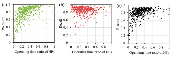 Relationship between operation time ratio of HPs and accuracy indicators of (a) precision, (b) recall and (c) F-score.