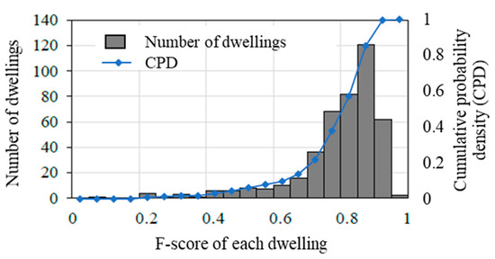 Figure 14 shows the histogram and CPD of the F-scores calculated for each dwelling. The F-scores for most dwellings ranged from 0.85 to 0.9, and 86% of the dwellings had F-scores above 0.7. Contrastingly, F-scores of remaining dwellings (14%) showed a long tail distribution with relatively low performance.