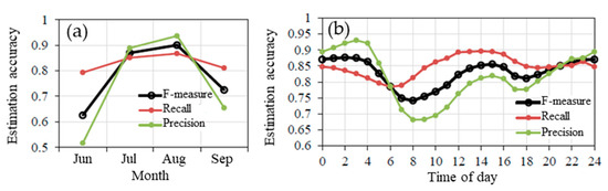 Figure 15 shows the variations in estimation accuracy with month and time of the day. August and July 2013 were the hottest months, and June and September were relatively cooler at the site where the load data were collected. The F-score for July and August was approximately 0.9, whereas that for September and June was less than 0.75. Precision and recall also exhibited a similar tendency; however, it was more evident for recall. This indicates that during the few months when HPs were not frequently used, the number of events in which they were mistakenly judged to be in the turn-on state increased.
