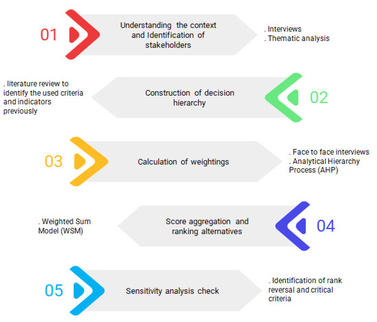 The methodology used in this research was adapted from Ling et al. [16] and divided into five steps, as described in Figure 1. Firstly, understanding the local context; secondly, the construction of decision hierarchy; thirdly, the calculation of weights; fourthly, score aggregation and ranking of the treatment alternatives, and finally, checking the sensitivity analysis and determining the critical indicators [16]. The development process was applied to compare three wastewater treatment alternatives that can be sustainable and suitable for the selected case study.