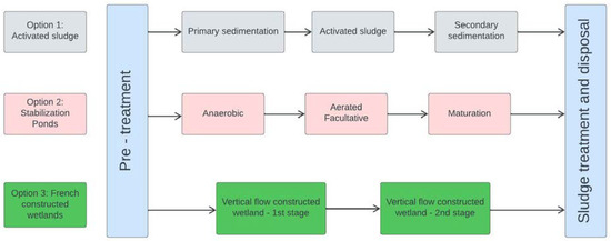 Wastewater treatment alternatives have been selected for the application of the criteria hierarchy and group weightings. The name and location of the wastewater treatment plant (WWTP) was mentioned before in the study and was clearly explained to the stakeholders. The proposed WWTP was designed to serve a population of approximately 15,000. The following three treatment alternatives were considered for the selected case: