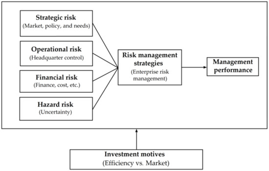 The OLI (ownership, location, internalization) theory proposes that location advantage determines the flow of international investment. However, different FDI motivations have different considerations for location advantages and the evaluation of the investment environment. Therefore, FDI motivations can be divided into market, efficiency, resources, and strategic asset-seeking [11]. A systematic risk management system for international enterprises was developed by COSO [12], which presents a concept of detailed circular processes for risk management, such as risk awareness, risk element analysis, risk control (avoidance, management, transfer, mitigation), and risk management performance evaluation. According to Agarwal, risk response and management can be divided into four main components, including strategic risk (SR) (such as economic environment, policy environment, population change, competition); financial risk (FR) (such as market risk, credit risk, price risk, liquidity risk); operational risk (OR) (such as human error, computer operation error, decision-making error, management process error); and hazard risk (HR) (such as property, regulations, individuals, breach of contract, etc.). Insurance can solve hazard risk, whereas strategic measures are needed to control the other three risks [13].