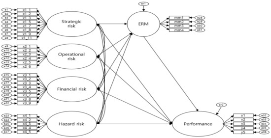 The purpose of this was to verify the suitability of the structural model, hypotheses, and their mediating effects. Figure 2 illustrates the detailed process of AMOS, outlining the relationship between risk factors, RM, and performance.