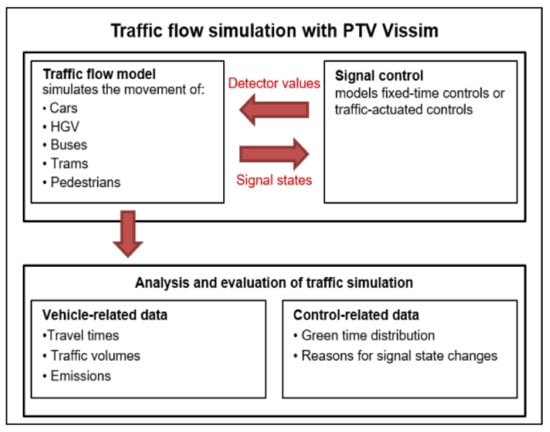 PTV VISSIM is the state-of-the-art microscopic simulation program widely used for modeling multimodal transport operations. Fixed Controls were used for the analysis of current conditions and scenarios of non-SAHER. Pre-timed controls often work with a repeated sequence of signal plans with fixed cycle lengths, offsets, and splits. For the analysis, the signal timing plans were developed offline and then optimized using traffic flow historical data. A combination of predetermined plans can accommodate the time of the day variations in the traffic volumes. However, when traffic volumes are predictable, fixed controls work much better. For each signalized intersection, the traffic flow simulation was carried out as shown in Figure 2 below: