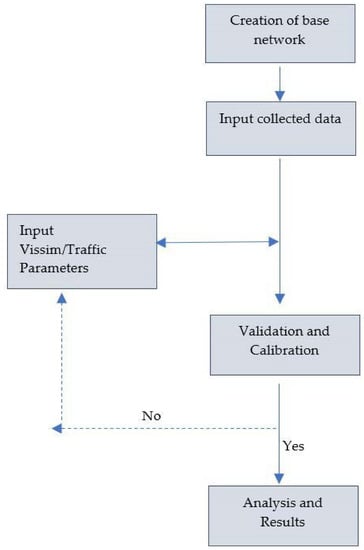 Microscopic software models have been widely used in analyzing transportation operations and management. Engineers may benefit from these models, but before they can be utilized to provide useful results, the models must be properly calibrated and validated. Mennini et al. (1997) validated the model in VISSIM using Weideman 99 coefficients. Similarly, Al Ahmadi (2019) used Weideman coefficients and queue lengths to validate the model network [11]. These models allow users to choose a range of values for each variable’s parameters for the default values. The traffic analysis methodology followed is presented in Figure 3 below.
