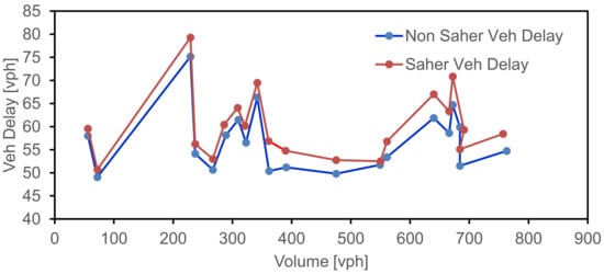 Average vehicle delay between SAHER and Non-SAHER scenarios.