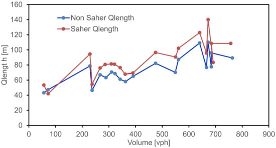 Similarly, analyses were performed for queue lengths for both SAHER and non-SAHER scenarios. However, dissimilar to the average delay, the maximum queue length measurement was observed to be significantly longer at signalized intersections implementing the flashing green interval and SAHER Cameras compared to their counterparts. The corresponding results are shown in Table 6 and Figure 5. The greatest deviation between the queue lengths for SAHER and non-SAHER intersections was witnessed at Khandak Intersection, which was around 22%, while Sa’a Intersection the difference between two scenarios was the lowest (12%). To sum up, a flashing green interval complimented with SAHER cameras fairly increased the vehicle delay and the maximum queue length measurements along the studied signalized intersections during the PM peak period. Since the drivers approaching the dilemma zones of flashing green lights with SAHER enforcement fail to completely use the time allocated for permitted movement, longer queues downstream of the intersections may be expected. Although the SAHER scenario may lead to longer queue lengths (as shown in Figure 5), they have positive implications and benefits for traffic safety improvement. Intersections without SAHER enforcement usually have more number of citations or ticket issues for speeding as well RLC compared to those with SAHER. Further, the installation of SAHER enforcement not only improves the drivers’ safety but also the safety of pedestrians crossing the signalized crossings. Frequently a reasonable trade-off between traffic safety and operational efficiency at signalized intersection junctions is established.