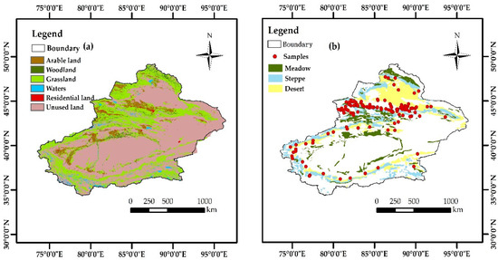 Distribution of desert grasslands and sampling points in Xinjiang. (a) Xinjiang land cover map; (b) sampling sites distribution map.
