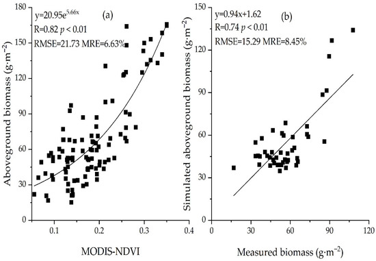 As shown in Figure 3, a significant correlation (p < 0.01) was observed between MODIS-NDVI and AGB. To validate the accuracy of the AGB estimation model for desert grasslands, we used 30% of the sample data. Figure 3 shows that the correlation coefficient between the measured AGB and inverse AGB was 0.74. The RMSE and MRE values of the estimated equations were 15.29 g·m−2 and 8.45%, respectively. This indicated that the exponential function model of NDVI and AGB was the best at representing the field conditions and can be used to estimate the AGB of desert grasslands in Xinjiang.