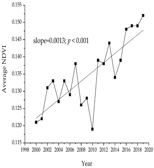 Variation trend of desert grassland NDVI from 2000 to 2019.