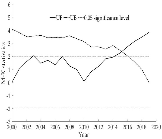 is the standard normal distribution, which is a sequence of statistics calculated in the order of the time series. We are then given the significance level a. If , then there is a significant change in the trend. We sort the time series into reverse order and repeat the above equation and make , , . When , the series is in an upward trend; when , the series is in a downward trend, and exceeding the threshold indicates a clear trend in the series. The intersection of the two curves, and , is the point at which the mutation begins.