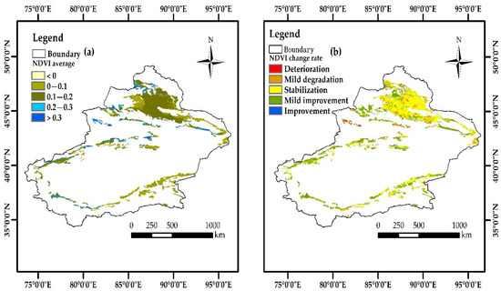 Spatial distribution of NDVI and change rate of desert grassland in Xinjiang from 2000 to 2019. (a) NDVI average; (b) NDVI change rate.