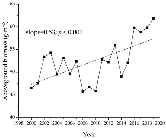 The AGB of desert grasslands in Xinjiang was the lowest in 2010 at 45.75 g·m−2 and reached a maximum of 61.82 g·m−2 in 2019 (Figure 7). For the whole study area, the AGB showed a slowly decreasing trend from 2000 to 2010, with a decrease of 0.30 g·m−2·a−1; on the other hand, from 2010 to 2019, the AGB showed an increasing trend, with an increase of 1.26 g·m−2·a−1. Overall, the AGB of desert grasslands in Xinjiang showed a highly significant increasing trend from 2000 to 2019 (p < 0.001), with an average annual increase of 0.53 g·m−2·a−1. Altogether, the AGB of the studied area showed a fluctuating increasing trend over the last 20 years.