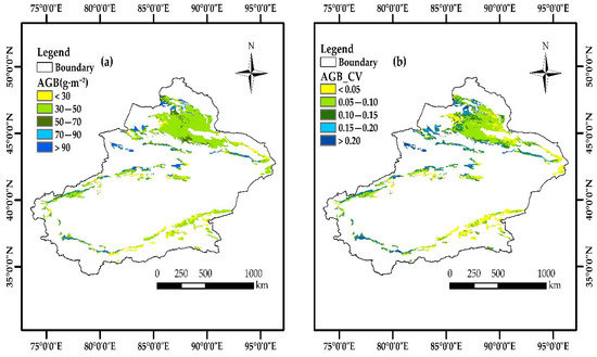 Spatial distribution of AGB and coefficient of variation of desert grassland in Xinjiang from 2000 to 2019. (a) Spatial distribution of AGB; (b) coefficient of variation of AGB.