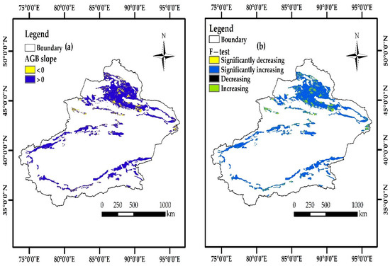 Spatial distribution of AGB trends and significance tests in desert grassland in Xinjiang from 2000 to 2019. (a) AGB trends; (b) significance of AGB trends.