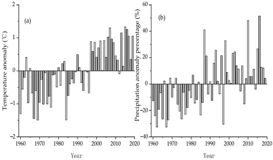 Variation characteristics of temperature and precipitation from 1960 to 2019. (a) Temperature anomaly (°C); (b) precipitation anomaly percentage (%).