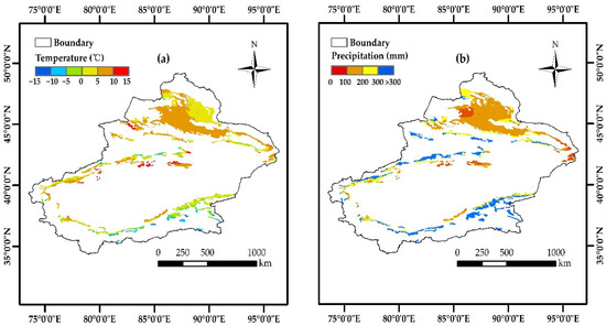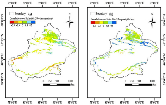 Correlation between AGB and climatic factors of the desert grassland in Xinjiang. (a) AGB and temperature correlation coefficient; (b) AGB and precipitation correlation coefficient.
