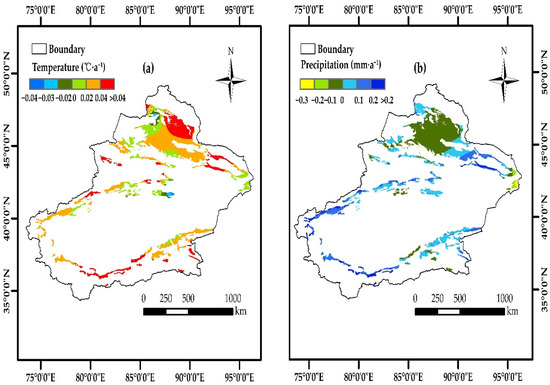Mean annual temperature and precipitation trends from 2000 to 2019. (a) The trend of temperature (°C·a−1); (b) the trend of precipitation (mm·a−1).