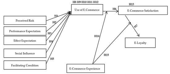Previous research has suggested that effort expectation, effect expectation, social influence, perceived risk and performance expectation and facilitating condition has an indirect and positive impact on e-satisfaction via the mediating effect of e-commerce [1,14,15,16,18]. In this study, it is anticipated that these constructs will influence customers to adopt e-commerce and consequently influence their e-satisfaction. Therefore, the following hypotheses are formulated: