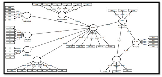 The current study’s questionnaire was adapted from previous studies. All responses to questions were graded on a five-point scale ranging from 1 (strongly disagree) to 5 (strongly agree). Performance expectation was measured using six items adapted from Venkatesh et al. [29]. Sampled items include: “I find that e-commerce is useful to me” and “Using e-commerce enables me to accomplish transactions more quickly”. Effort expectancy was measured using six items adapted from Venkatesh et al. [29]. Sampled items include: “Learning to use the e-commerce would be easy for me” and “It would be easy for me to become skillful using e-commerce”. Social influence was measured using six items adapted from Venkatesh et al. [29]. Sampled items include: “I feel people around me would encourage me to use e-commerce” and “People who are important to me would think that I should use e-commerce”. Facilitating conditions were measured using six items adapted from Venkatesh et al. [29] Sampled items include: “I have the resources necessary to use the e-commerce” and “Guidance was available to me in the selection of the e-commerce platforms”. Perceived risk was measured using six items adapted from Venkatesh et al. [29]. Sampled items include: “I would not feel safe providing my information to an e-commerce website”. The UEC was measured using six items adapted from Venkatesh et al. [29]. Sampled items include: “Using the e-commerce is a good idea” and I find using the e-commerce to be enjoyable”. E-commerce satisfaction was measured using three items adapted from Hsu et al. [71]. Sampled items include: “I am satisfied with the online shopping experience” and “I am pleased with the online shopping experience. The e-commerce experience was measured using three items adapted from Hao Balaji, and Kok Wei [72]. Sampled items include: “Online retailer’s website is convenient as it allows me to know and compare the products” and “The online retailer’s website creates a shopping experience that is appealing and enjoyable”. Customer loyalty was measured using four items adapted from Ribbink et al. [62]. Sampled items include: “I will recommend this online company to other people” and “I would recommend this company’s website to others”.