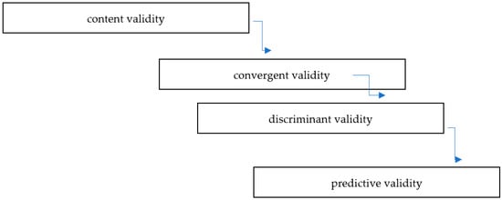 Construct validation is an essential step for the scale development process, which deals with the accuracy of the measurement. It refers to “the extent to which a set of measured variables actually represent the theoretical latent construct they are designed to measure” Hair et al. []. Based on the frameworks of [,], this study included four steps for construct validation: (1) content, (2) convergent, (3) discriminant, and (4) predictive validity, see Figure 1.