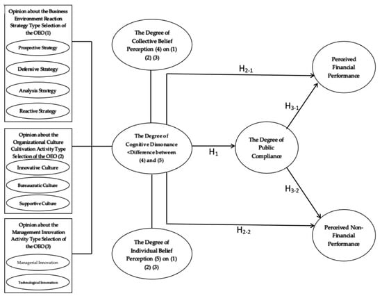 Based on the cognitive dissonance model proposed by Festinger [8], the Likert scale was used to assess the opinions of organization members on the type of reaction strategy to the business environment, the type of organizational culture cultivation activity, and of management innovation activity selected by the company CEO. The degree of cognitive dissonance was described as the difference (absolute value) between the average value of all respondents (the degree of collective belief-perception) and the respondents individually (the degree of individual perception). It was assumed that opting for a specific type of business environment reaction strategy, organizational culture cultivation activities, or management innovation activities with a group of organizational members will yield rewards to them. In addition, the study tested the question of “Do you think and act differently when confronted with different opinions and thoughts regarding the type of business environment reaction strategy, organizational culture cultivation activity, and management innovation activity?” using Likert 5-point scale (① I will not change my thoughts and actions, ② I am negative, ③ I am reluctant, ④ I am positive, ⑤ I will actively change my thoughts and actions). As a result, this study conducted a survey to determine whether the person will abandon his or her own views and beliefs in order to act according to the indicated communal perceptions and ideas. The data was obtained from 9 items. The degree of public compliance is represented by the average value of the total respondents for these items.