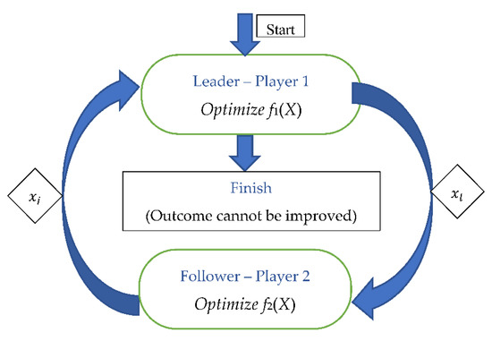 In a Stackelberg (hierarchical) game, the Leader defines its strategy and is the first one to play (maximize or minimize f1(X) using, as example, the Excel®-Solver tool). Then, the Follower reacts by using its own strategy, which depends on the Leader’s strategy. This sequential process stops when the Leader cannot improve his/her payoff, which means that an equilibrium solution is found [34]. As an example, let’s assume that a player (player 1) acts as the Leader and aims at optimizing f1(X) by processing one or more input variables () from X, while player 2 acts as the Follower and its purpose is to optimize f2(X) by processing the remaining input variables () from X. The rational strategy played is represented by () ∈ (S, Sxj), where S and Sxj are the rational strategies of the player 1 and 2, respectively. As shown in Figure 1, at each iteration, player 1 (the Leader) minimizes by varying , while remains unchanged, and then player 2 minimizes by varying , while remains unchanged (fixed by the player 1). The game ends when no player can achieve any additional gain or a better outcome, which means that a Stackelberg equilibrium point is found. This solution is called a Pareto-optimal equilibrium point if the Stackelberg equilibrium point is also a nondominated (Pareto) solution, that is, a solution where any improvement in f1(X) cannot be achieved without degrading the value of f2(X).