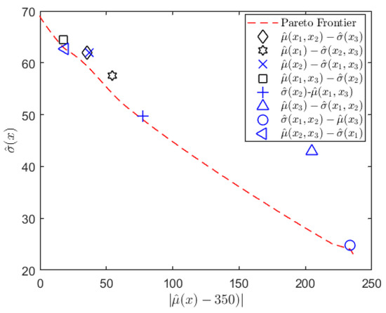 This case study also enables the affirmation that the Stackelberg technique can capture POE solutions in DRO problems developed under the RSM framework, such as that shown in Figure 3. Notice that eight games (those whose solutions are represented by the plus sign, diamond, hexagram, cross, and triangle) yield nondominated solutions, six of them have the mean on target, those represented by the plus sign, hexagram, diamond, and cross. The solutions represented by the circle and the left-pointing triangle are at a negligible distance from the Pareto frontier so they can also be considered as alternatives to POE solutions, in contrast to those solutions represented by the square and the right-pointing triangle, which are dominated solutions.
