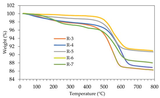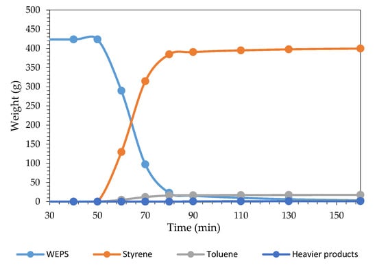 Figure A3. The same WEPS weight loss as a function of time and the weight evolution over time of the liquid fraction trend was observed in all the experiments, even when the regenerated MgO catalyst was used, or no catalyst was used. At the beginning of the pyrolysis, a large volume of liquid products with a very high styrene concentration was obtained. As the reaction progressed, a decrease in the concentration of styrene was observed, and the concentration of toluene, ethylbenzene, and heavier products (methyl styrene, propenyl benzene, butenyl benzene, and the dimer) increased, but a considerable reduction in the volume of liquid products (oil) was observed.