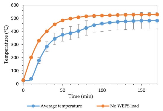 Figure 10. In the second case, no temperature increase was observed in the first 10 min of heating in the blue graph because the WEPS charged to the rotating reactor melted in those first minutes of heating, which was not observed in the WEPS no-load temperature test (orange plot).