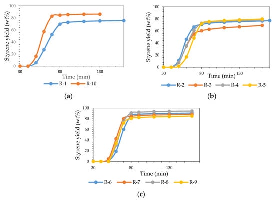 Figure 11a–c. The evolution of the styrene yield over time of the experiments carried out using the rotating reactor without catalysts R-1 and R-10 is shown in