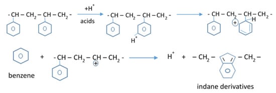 20]. These products are partially attributed to the subsequent degradation and hydrogenation of the styrene produced, which results in a decrease in the styrene fraction in oils obtained. The production of benzene and indane derivatives is also one of the characteristics of the oils produced by solid acid catalysts, which were not detected in oils obtained with solid base catalysts. In a mechanism model proposed by Zhang et al. [