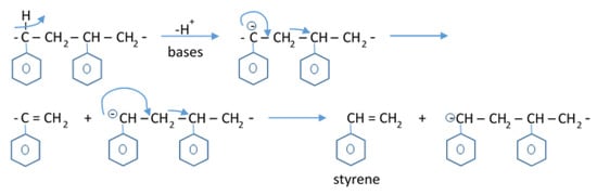 On the other hand, with basic catalysts, the fraction of styrene in the produced oils increased to about 75 wt% and the fraction of styrene containing the monomer and dimer to about 90 wt%. Since benzene and indane derivatives were not detected in oils produced with solid bases nor in those obtained with simple thermal degradation of polystyrene, and since a considerable amount of styrene dimer was observed in these oils, it is considered that the depolymerization of polystyrene using solid bases proceeds in a similar way to simple thermal pyrolysis. Thermal degradation of polystyrene begins with the random formation of polymeric radicals, while catalytic degradation with solid bases can begin with the formation of carbocations by removal of a hydrogen atom from polystyrene adsorbed on basic sites, according to the reaction mechanism model proposed by Zhang et al. [