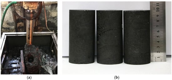The diagram of coal sample preparation ((a) core drilling; (b) the samples).