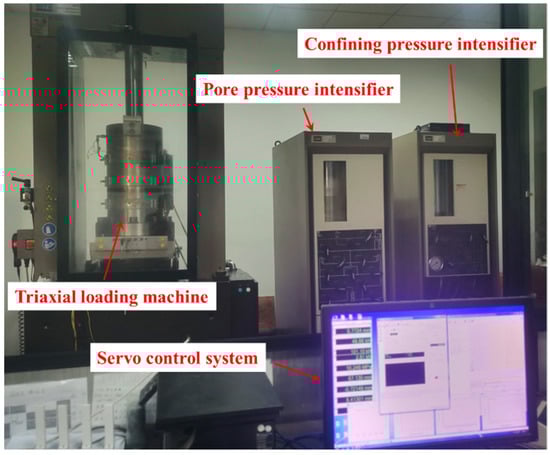 The MTS815 test system of Hunan University of Science and Technology is used in this procedure (Figure 2). The maximum axial force is 4600 kN, the maximum confining pressure is 140 MPa, and the maximum pore pressure reaches 140 MPa. High temperature heating equipment can reach up to 200 °C.