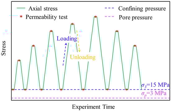 In order to protect the experiment equipment, the stress control method is adopted before the axial stress reaches 80% of the estimated peak stress, and the loading rate is 20 kN/min. When the stress exceeds 80% of the estimated peak value, the loading method is changed with the displacement-controlled mode, with a rate of 0.3 mm/min. The unloading rate is 20 kN/min throughout the test. The detailed test steps are as follows (Figure 3):