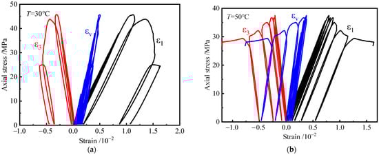 In order to study the influence of temperature on the permeability evolution of deep coal, confining pressure (15 MPa) and pore pressure (3 MPa) remain unchanged in this test. In addition, the loading and unloading axial stress are carried out to the residual stage of coal. Four temperature gradients are set in this experiment: 30 °C, 50 °C, 70 °C, and 90 °C.