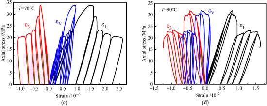 Stress–strain curves of cyclic loading and unloading under different temperatures. (a) T = 30 °C, (b) T = 50 °C, (c) T = 70 °C, and (d) T = 90 °C.