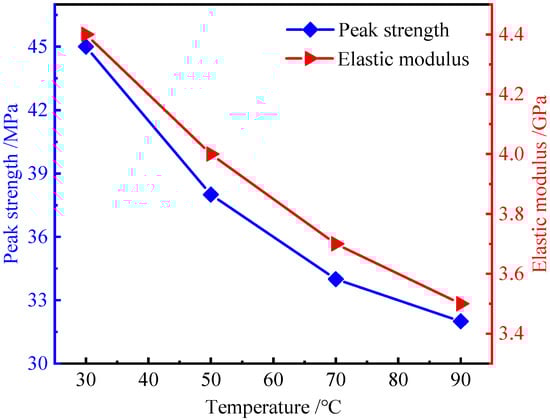In order to visually analyze the evolution of the mechanical parameters, such as the peak strength and the elastic modulus of coal with temperature, the data in Table 2 are plotted in Figure 5.