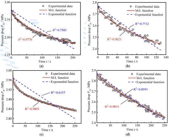 Figure 6 shows the comparison results with M-L function and the exponential function, fitting the pressure drop with time for one cycle under different temperature conditions. It can be seen that the M-L function has a better fitting presentation for the pressure drop trend over time, therefore, the fitting coefficient a that is obtained by this function is more accurate, and the permeability that is measured and calculated is closer to the actual situation. The result is also consistent with the study of Zhou et al. [] and Zhou et al. [].
