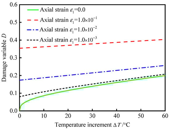 In order to demonstrate the influence of stress and temperature on coal damage more intuitively, the evolution trend of the coal damage with temperature under different external load conditions is analyzed in this section, combined with Equation (16), in order to characterize the internal damage of the coal, as shown in Figure 8.