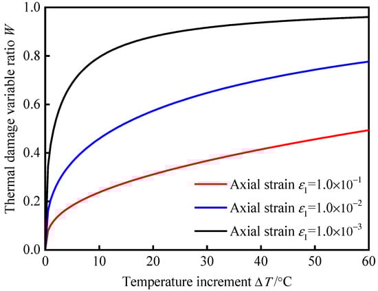 The key parameters p and q have been determined by the cyclic loading and unloading experimental data at different temperatures. The influence of the temperature on the damage process of the coal is emphatically analyzed, as shown in Figure 8. When the external mechanical load has not acted on the coal, the damage to the coal is mainly caused by the change in the temperature. The larger the temperature increment, the greater the damage and failure degree of the coal. When the external load is gradually applied to the coal body, the damage process of the coal is affected by both the temperature and the external load. Under different external loads, the evolution law of the coal damage with temperature is also different. In order to further analyze the contribution degree of the temperature to coal damage under different external loads, the thermal damage variable ratio W is defined,