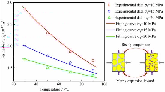 It can be seen from Table 3 and Figure 10 that the fitting result of this model for the experimental data is perfect. When the effective stress remains constant, the permeability is reduced with the temperature in exponential form. This is because, under the same low stress state, with the increase in the temperature, the matrix solid particles swell, and due to the constraints of the confining pressure, the coal matrix expand only inward, which makes the initial pores and fractures compressed, resulting in the permeability decreasing.