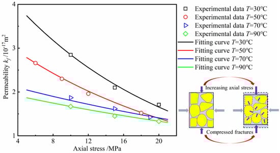 As an important part of deep coal resources, gas has gradually changed from a threat to the safe mining of coal resources to a sustainable clean energy. Both in terms of experimental research and theoretical modeling, the study of gas migration is developing gradually [,,]. Silva et al. [] and Huang et al. [] respectively analyzed the permeability evolution of shale and sandstone with temperature from the perspective of experiments and found that, under the same effective stress and temperature below 100 °C, the permeability decreased with an increase in temperature. In order to study the evolution law of permeability with temperature in deep coal under cyclic load, the theoretical model of permeability evolution with stress and temperature is firstly established in this section, then the experimental data is fitted and analyzed, and the conclusion is drawn.