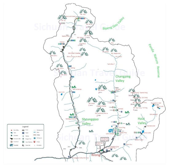 Map of Mt. Siguniang Scenic Area. Source: www.sichuantravelguide.com (accessed on 3 November 2022).