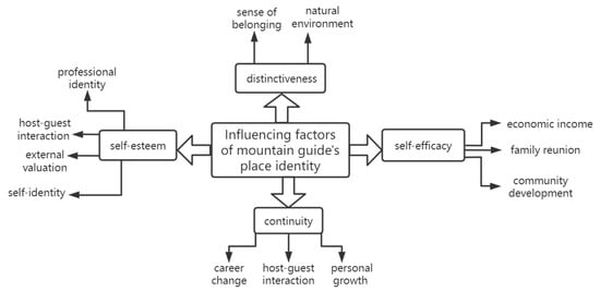 Combined with previous research, the content in this section is divided into four parts, namely self-esteem, self-efficacy, continuity, and distinctiveness. These four dimensions of place identity are a heuristic method for examining place identity [61], as well as a powerful interpretive tool for this study [62]. Therefore, an analysis on the influencing factors of mountain guides’ place identity is presented in this section.