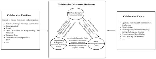 Designing a successful and efficient collaborative governance mechanism to promote the value co-creation of complementors has become critical to platform owners. Therefore, using an evolutionary game theory approach, we first constructed a conceptual model of collaborative governance, analyzing the conditions of collaborative governance of multiple subjects. This was based on the belief that the design of a collaborative governance mechanism needs to nurture collaborative culture and internalize it into the practice of platform governance. Secondly, this paper built a tripartite evolutionary game model of platform enterprises, complementary enterprises, and users, systematically illustrating the strategy evolution process of the three parties under incentive and penalty mechanisms, and simulated the influence of parameters, such as cost, culture, and cooperative willingness, on the evolutionary results. The results showed that: (1) A culture of trust and encouragement of innovation was more conducive to collaborative innovation; (2) Platform enterprises are more sensitive to joint cost investment, work culture environment, and benefit distribution; (3) Complementary enterprises and users have a solid ambition to respond to the impulses of digital technology. In particular, when the initial desire to collaborate is low, the evolutionary process of platform enterprises presents an asymmetric ‘U’ shape. To enable stakeholders of the platform to formally, prudently, and deeply participate in the ecological governance process, platform enterprises should fully use network resources and digital technology to build a platform for high-intensity interaction and communication between complementary enterprises and users, and improve their identification with the innovation culture.