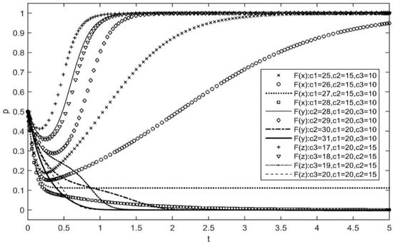 Figure 2 presents the impact of the change in governance costs on the players’ strategy choices. The critical value of was in the interval when the governance cost of the complementary firms was 15 and that of the users was 10. When was lower than the critical value, converged to 1. That is, the platform firms eventually chose the subsidy strategy, and the smaller was than the critical value, the faster converged to 1. When was greater than the critical value, converged to 0. The platform eventually chose the penalty strategy, and the larger was than the critical value, the faster converged to 0.