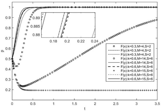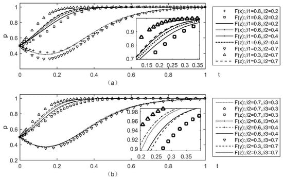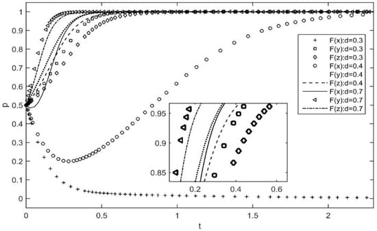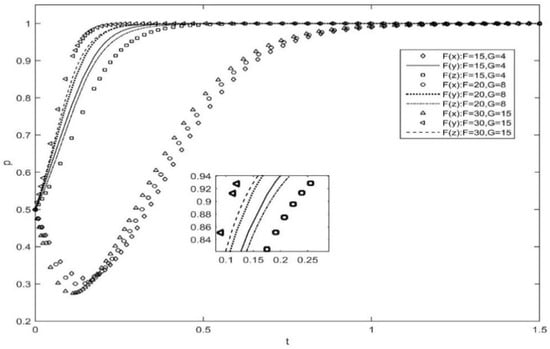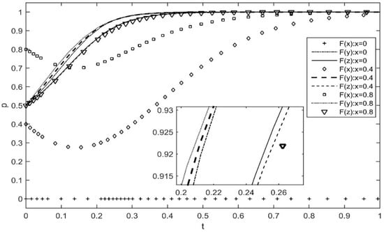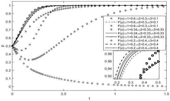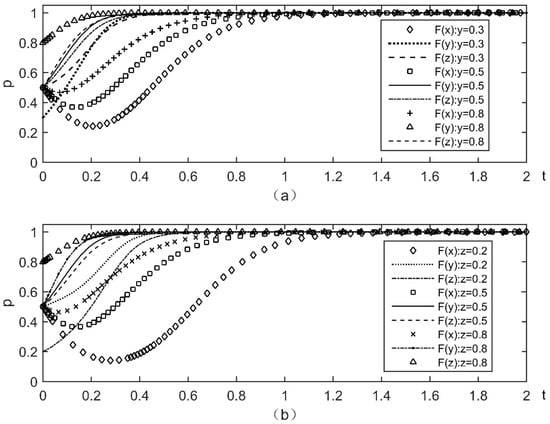 Assuming that other parameters remain unchanged, Figure 3 represents the effect of changes in the incentive strategy of platform enterprises, under the condition that the probability of complementary enterprises and users actively participating in governance is 0.5. The difference in the probability of platform firm subsidies hardly impacts the willingness of complementary firms and users to actively participate. When , the platform enterprises prefer to adopt a punitive approach to governance, and complementary enterprises and users will eventually choose to actively innovate, due to the loss caused by the inadequate performance of responsibilities.
